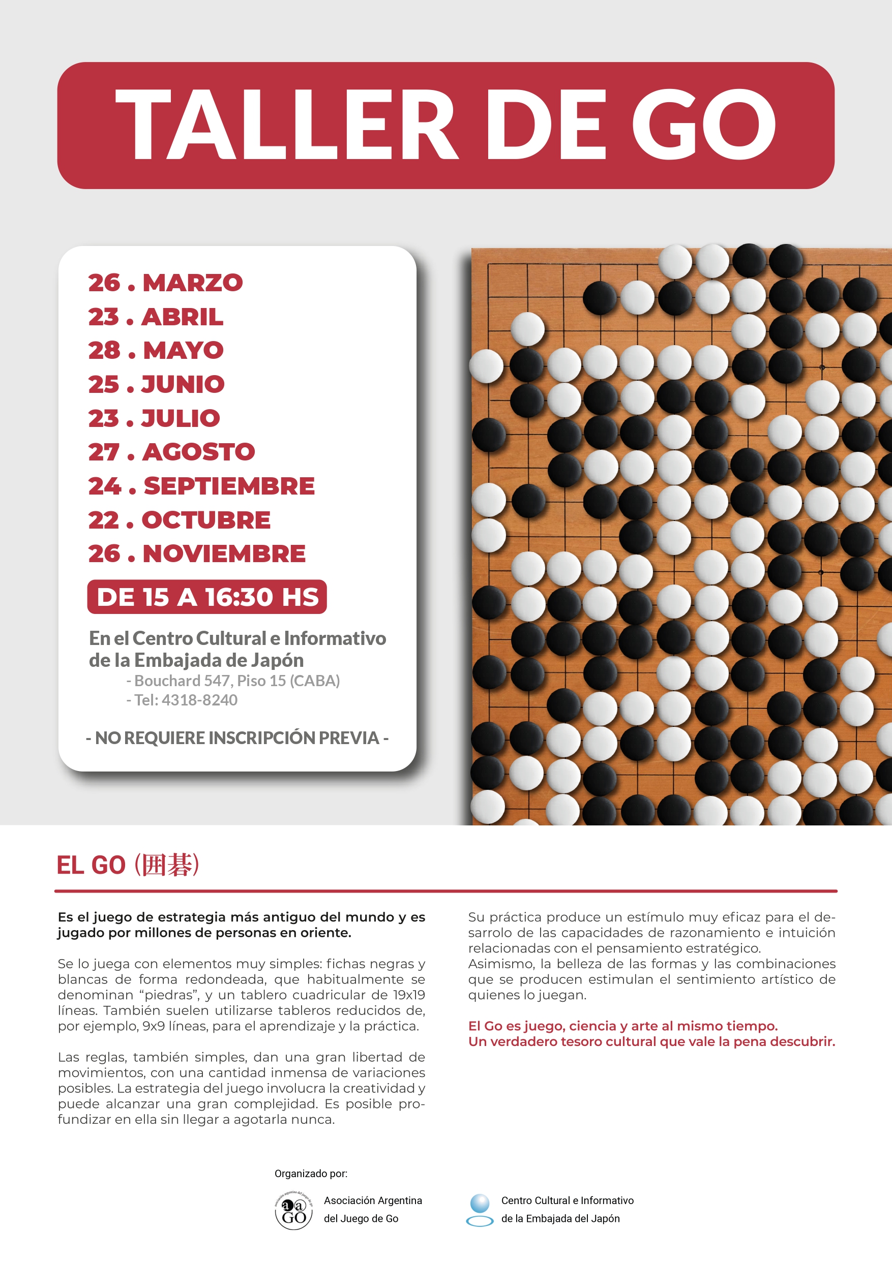 ¡Vuelven los talleres de iniciación al go en el Centro Cultural e Informativo de la Embajada de Japón! Clase de introducción al go y espacio de juego. ¡Les esperamos!