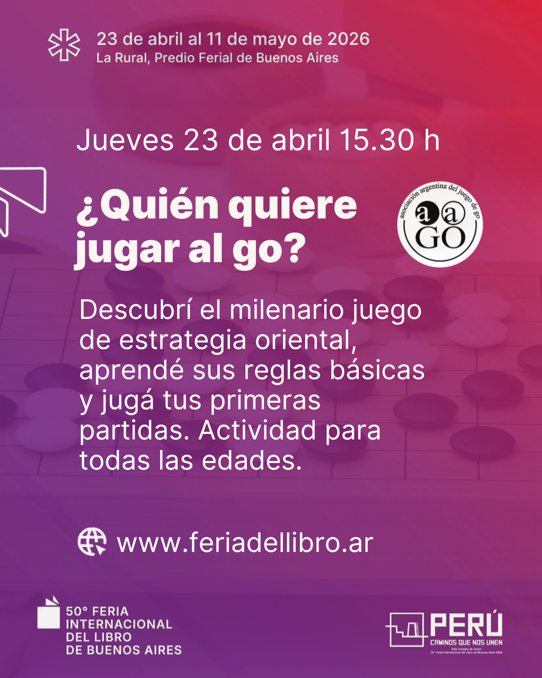 La Feria Internacional del Libro de Buenos Aires cumple 50 ediciones y desde la Asociación Argentina de Go estaremos presentes el día inaugural celebrando, enseñando y jugando go con el público!